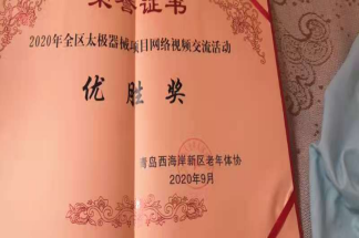 9月,协会会员王萍、杨静、徐永梅、孙玉芹、许英顺、张锐等参加了青岛西海岸新区首届老年人体育健身大会太极拳太极器械健身气功集体项目网络视频交流活动,参赛项目为功夫扇,取得了优胜奖。